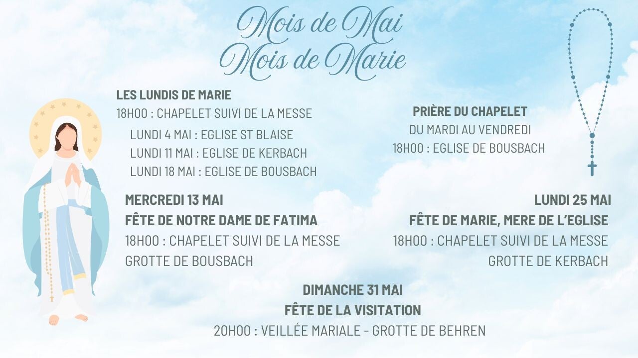 - Mardi : 18h à Behren (A St Blaise d'Avril à Septembre, à St Jean Bosco d'Octobre à Mars) - Une semaine sur deux - voir bulletin paroissial